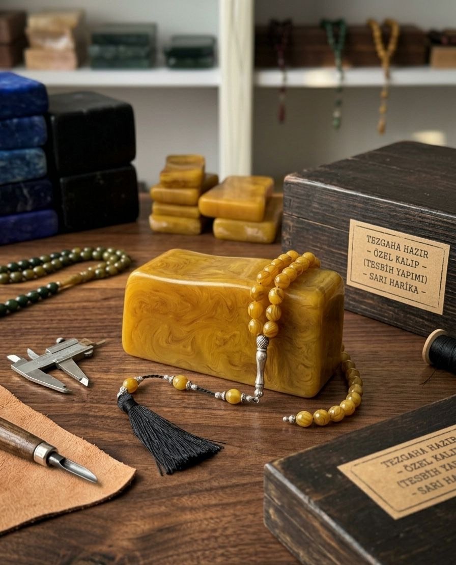 Tesbih ustaları için bal sarısı sıkma kehribar blok, estetik ve kaliteli tesbih üretimi için ideal bir tesbih ham maddesidir.