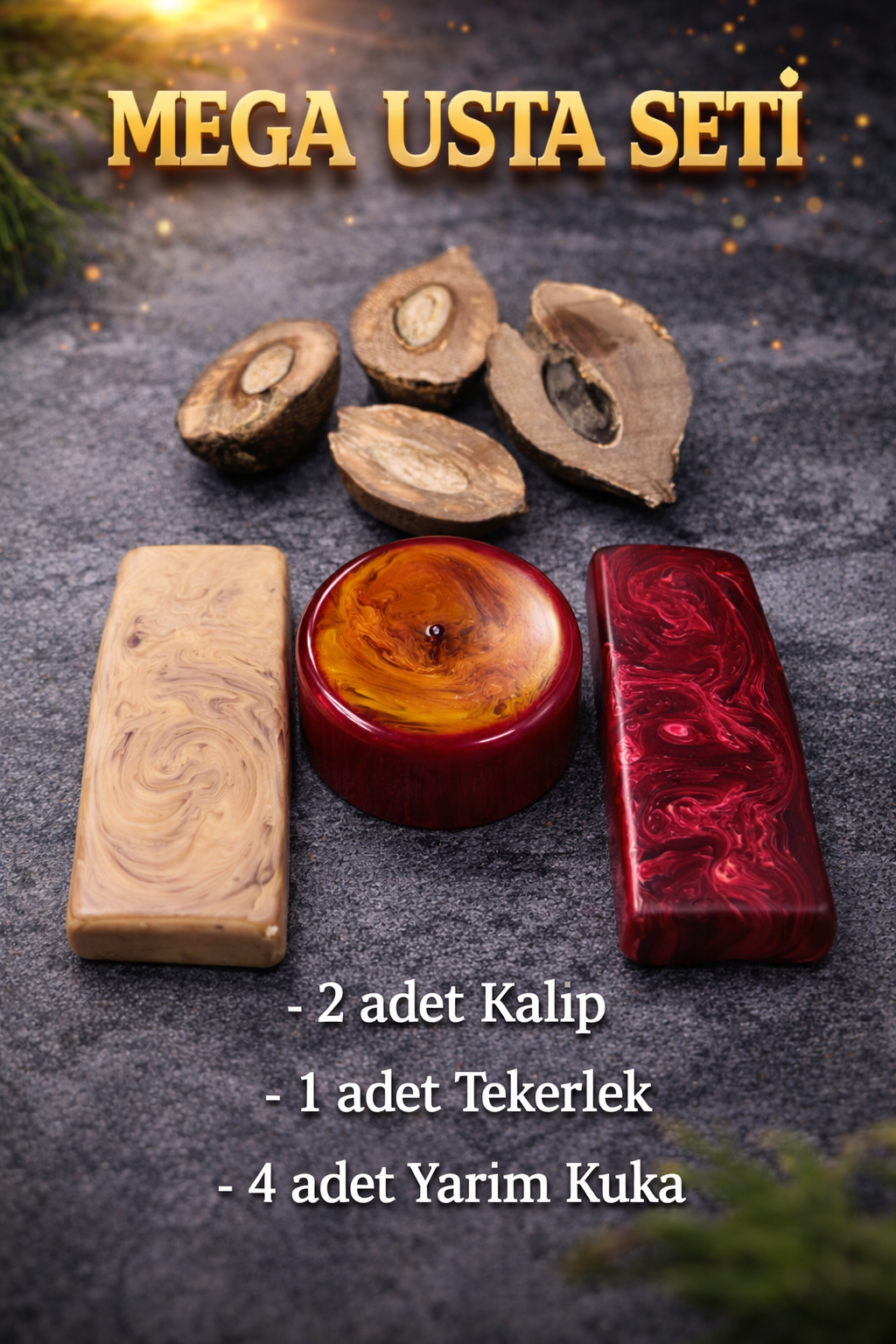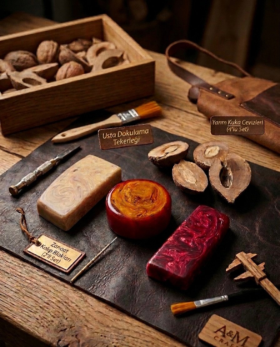Set içerisinde yer alan 2 adet kalıp, 1 adet tekerlek ve 4 adet yarım kuka; birden fazla tesbih üretimi için yeterli çeşitlilik sunar. Malzemeler, işlenebilir yapıları sayesinde torna ve el işçiliğine uygundur.
