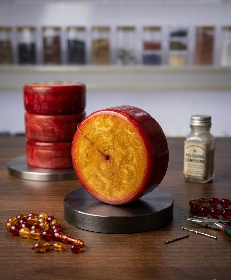 Tesbih yapımı için ideal 38×88 mm tekerlek formunda kehribar görünümlü dayanıklı ve kolay işlenebilir hammadde.
